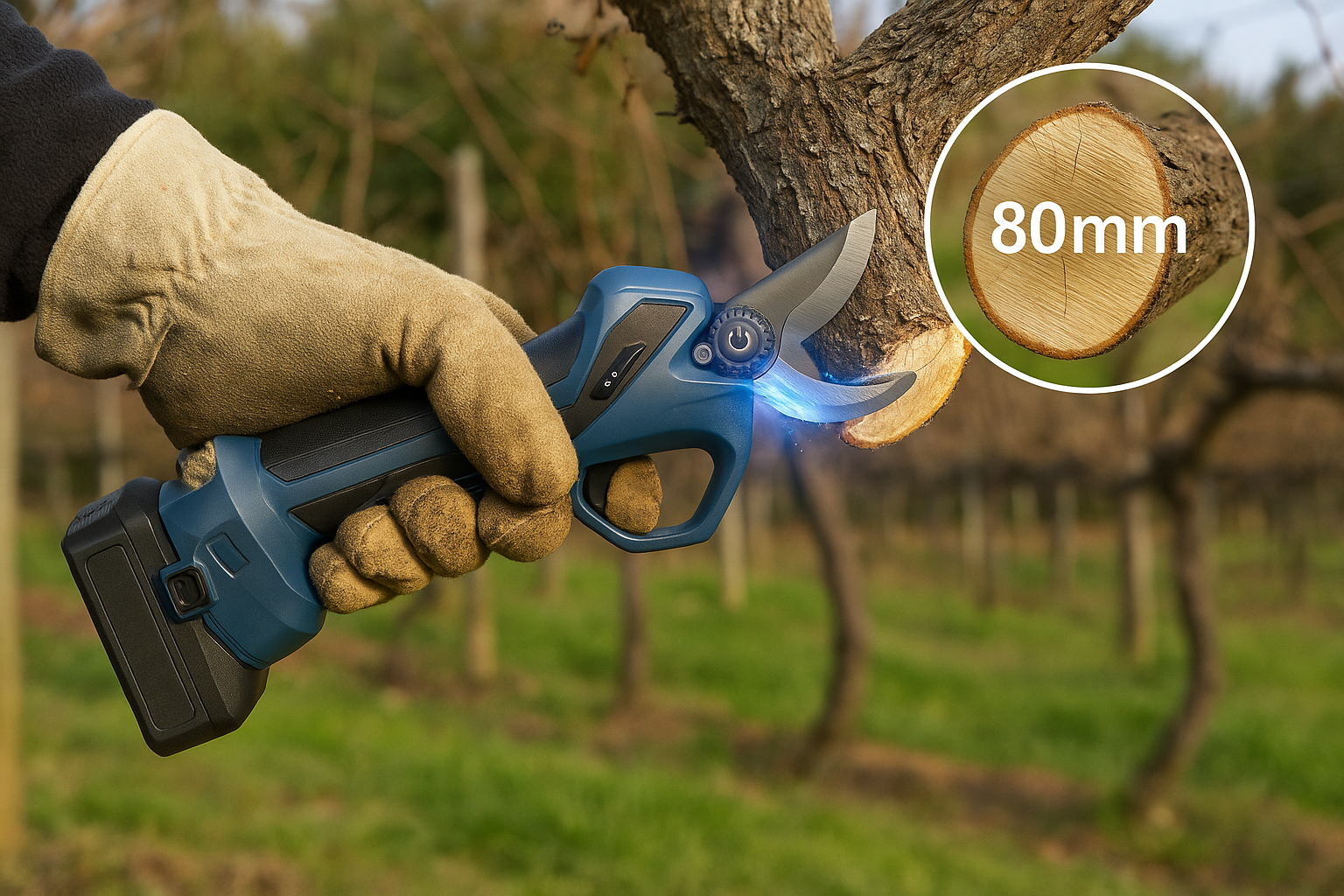 Senza sforzo e in meno di un secondo, la cesoia elettrica taglia rami fino a 80mm (8cm) di diametro.