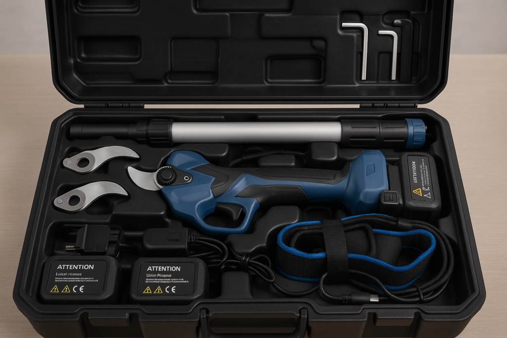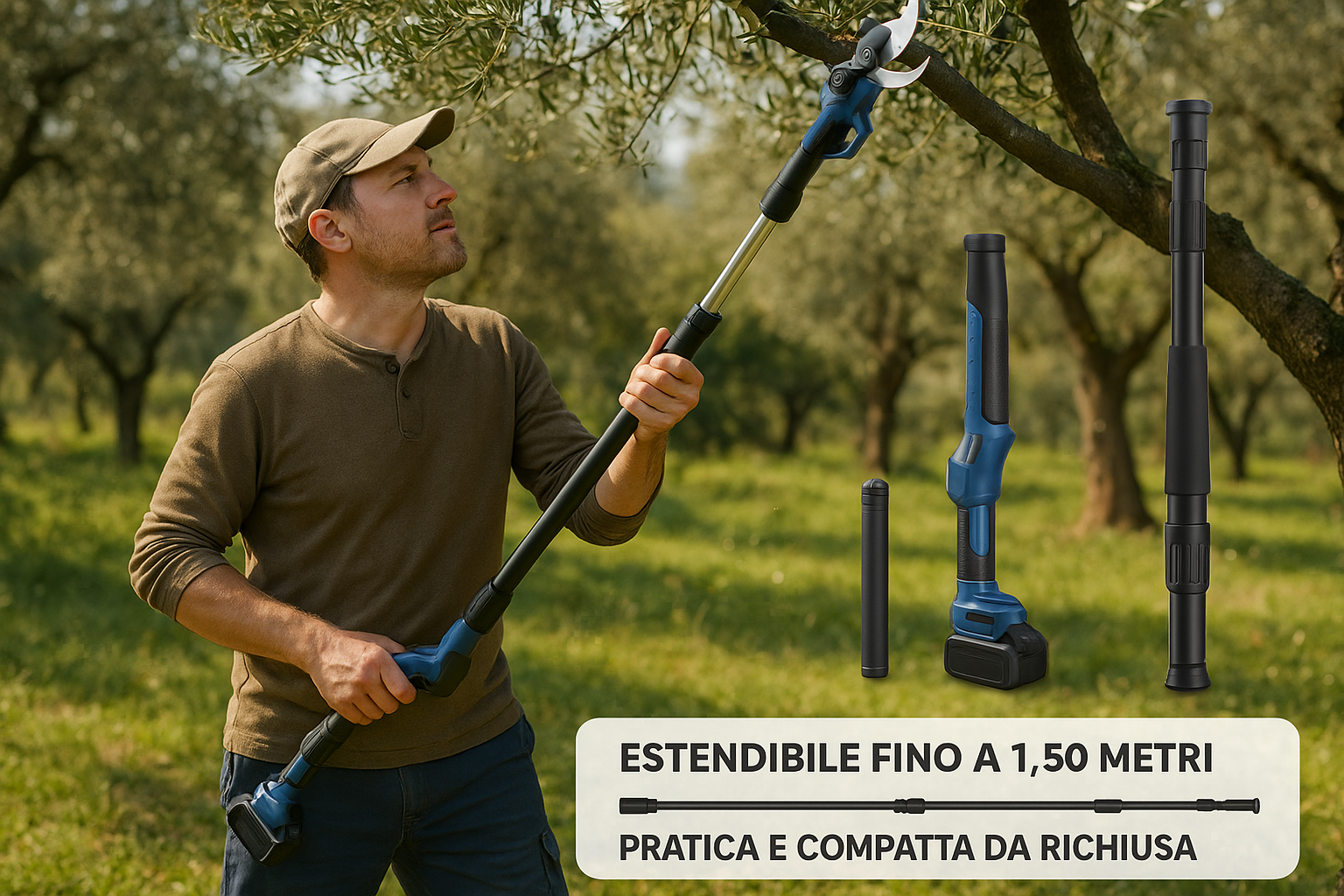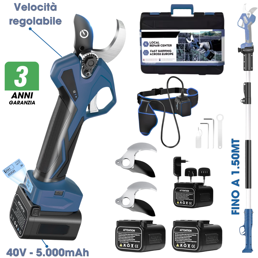 Cesoia Elettrica Senza Fili 1.050W (40V-5.000mAh) + Asta Telescopica allungabile 150cm + 2 batterie + KIT Accessori Completo